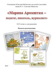 Лекарство от плохого настроения: методико-библиографические рекомендации к 70-летию со дня рождения С. А. Махотина / составитель Т. В. Голубцова ; редактор В. С. Матюшина ; технический редактор Е. Б. Саидова ; ответственный за выпуск С. А. Петрищенкова ; ГБУК «Смоленская областная библиотека для детей и молодёжи». – Смоленск : [б.и.], 2023. – 16 с. Методико-библиографические рекомендации подготовлены к 70-летию со дня рождения детского поэта, прозаика, журналиста Сергея Анатольевича Махотина и содержат примерный сценарий проведения игровой программы с учащимися 3-4 классов по его произведениям. Будут полезны для педагогов, библиотекарей, руководителей детского чтения. |