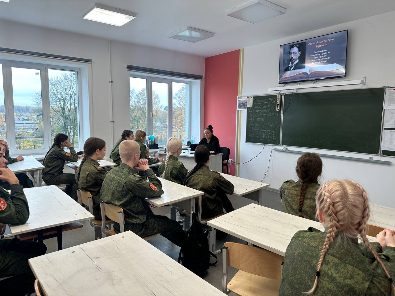 20 октября в Смоленском фельдмаршала Кутузова кадетском корпусе одиннадцатиклассники стали участниками тематической беседы-обзора, приуроченной к 155-летию со дня рождения Ивана Бунина.