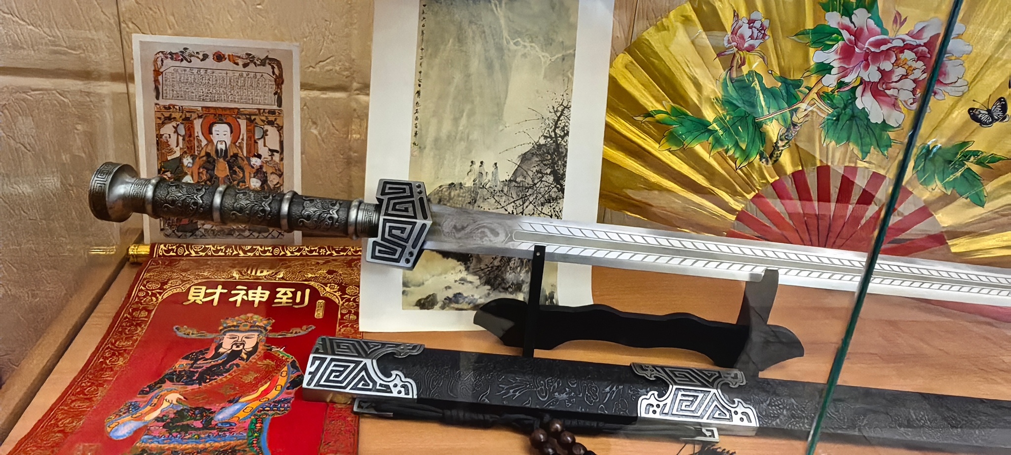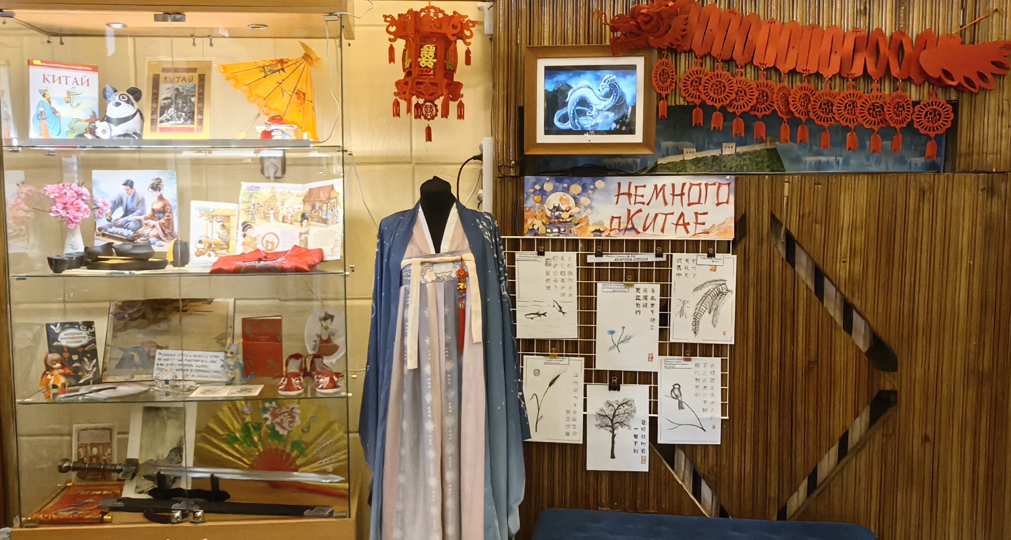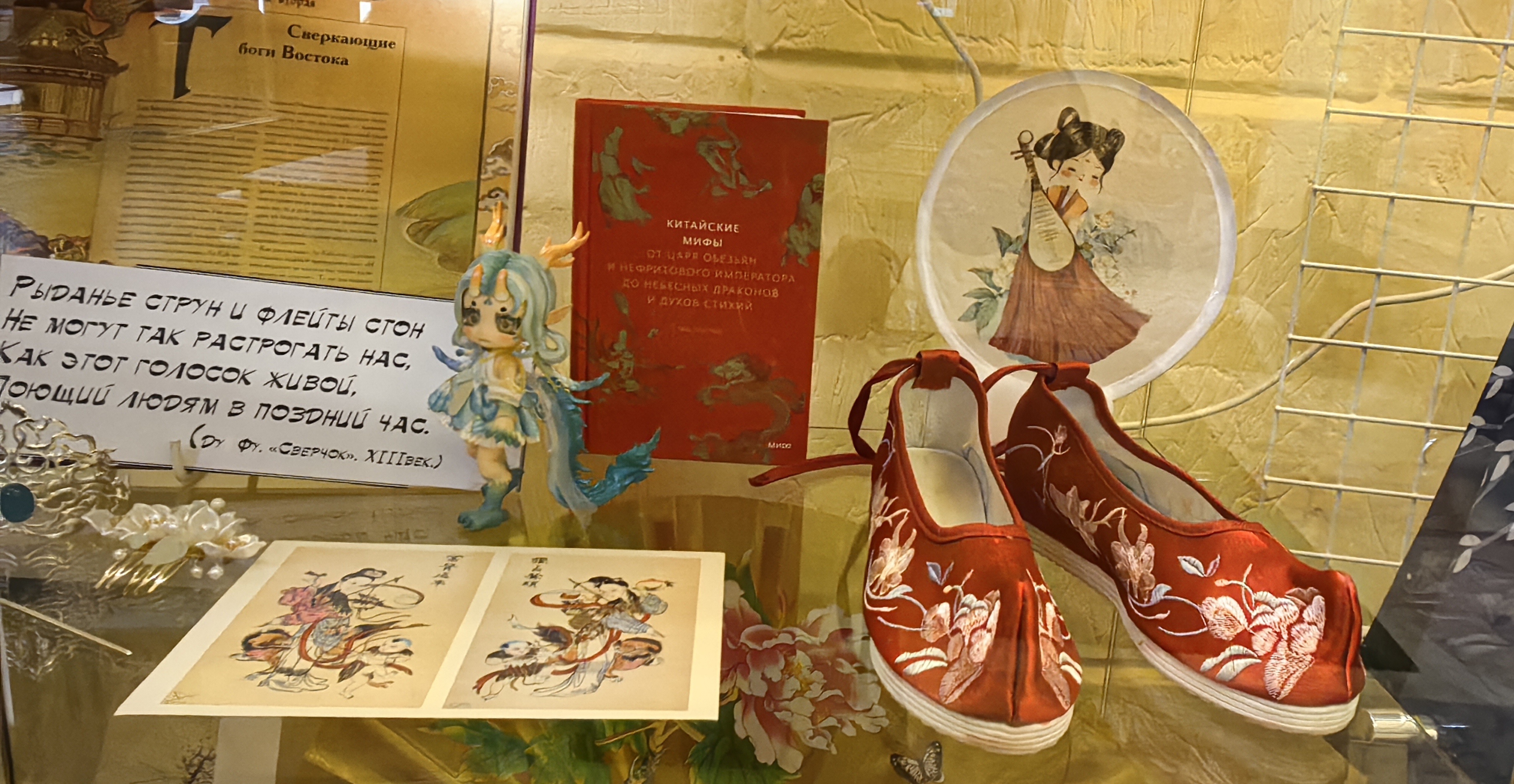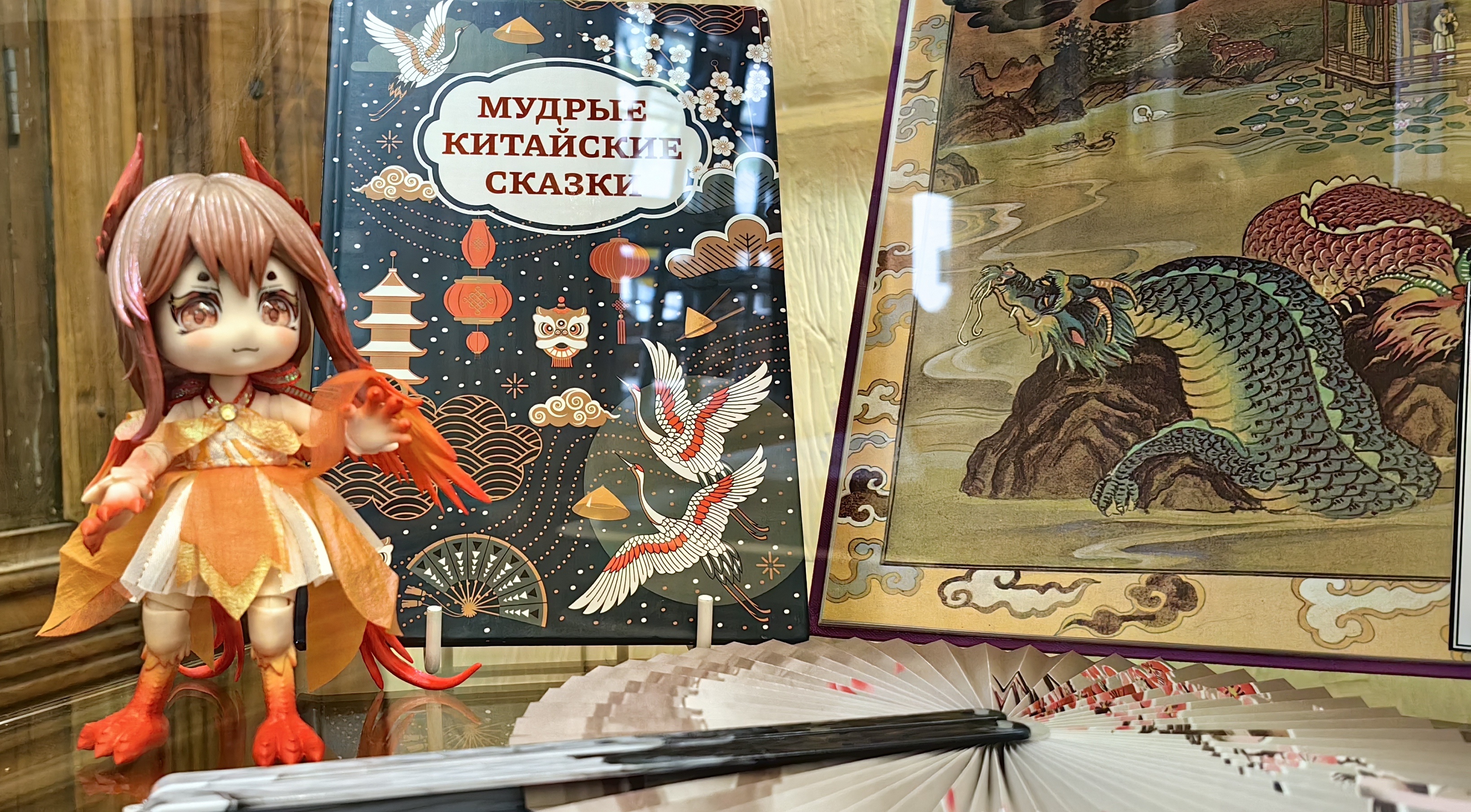 На выставке, оформленной в традиционных китайских тонах — алом, золотом и лазурном, представлены сказки и мифы Поднебесной о мире драконов и бессмертных мудрецов; репродукции национальной классической живописи с пейзажами в стиле «горы и воды» (шань-шуй); фарфоровая ваза с росписью, зонтик и изящные веера с орнаментами, демонстрирующие тонкое искусство декора; китайский наряд – элегантное ханьфу, дополненное изысканными украшениями с мотивами лисицы и цветов. Кроме того, здесь можно увидеть обаятельного посла китайской природы – игрушку-панду ручной работы, копию средневекового меча и традиционный чайный сервиз.